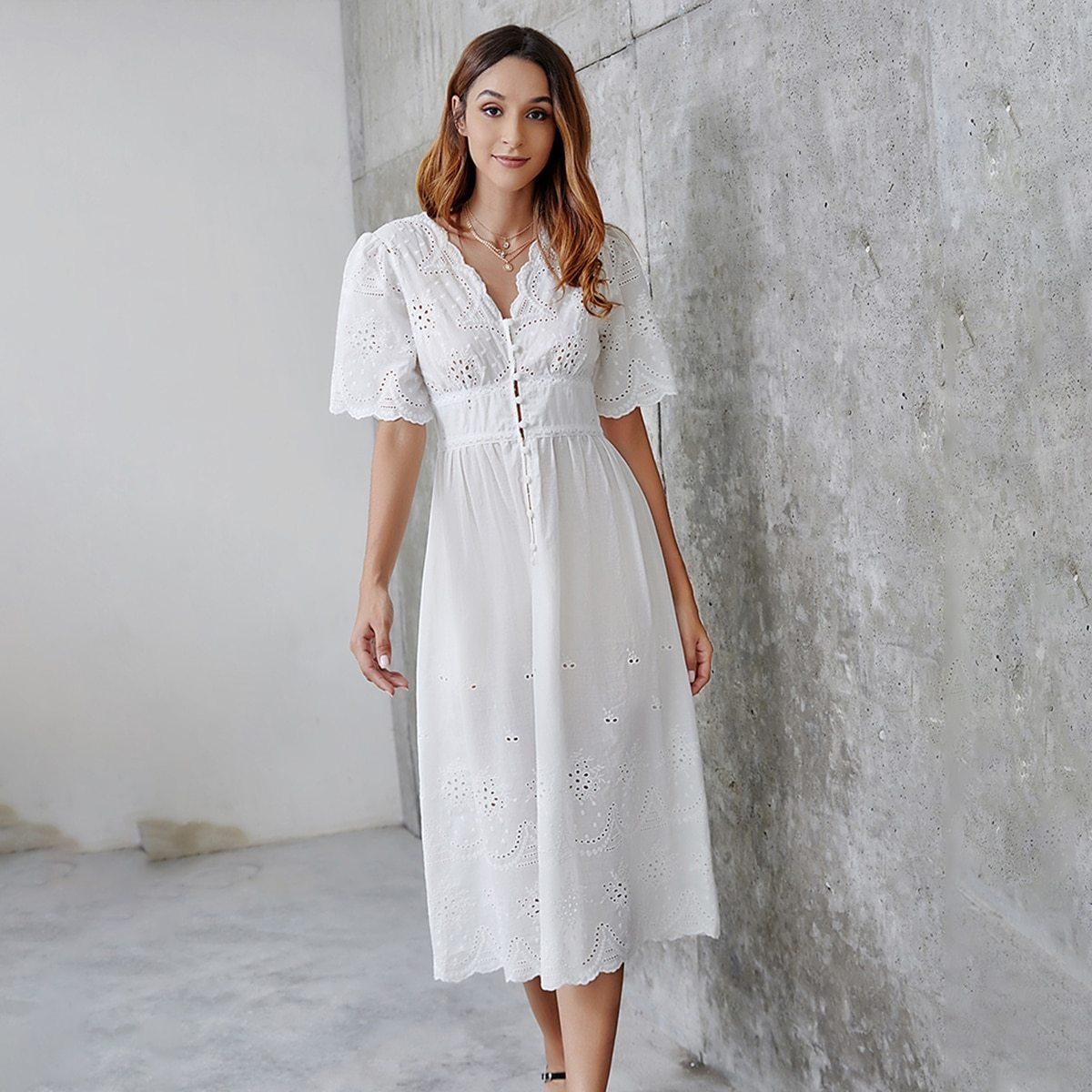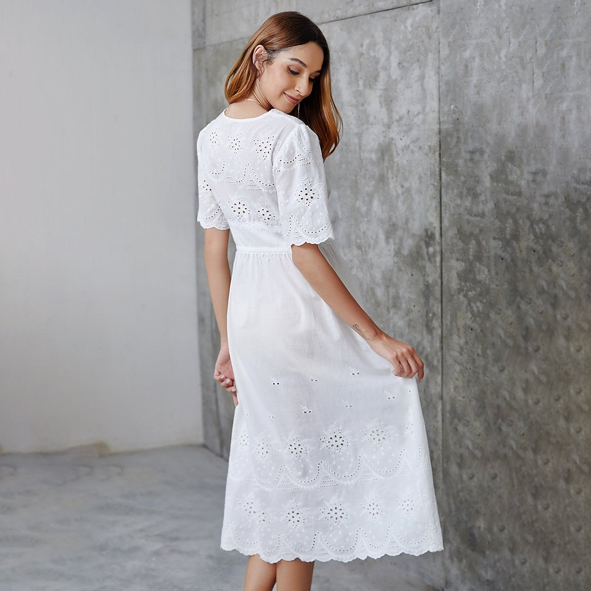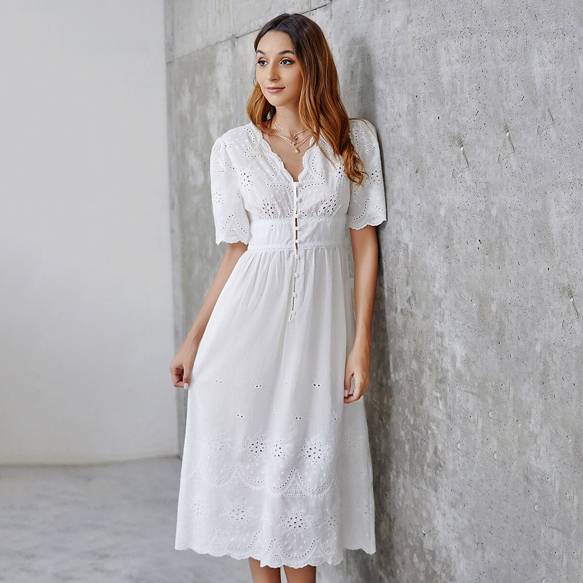 Cette robe blanche longueur maxi au style hippie est le choix idéal pour exprimer vos valeurs avec style et élégance. Sa texture légère et sa qualité premium en font un vêtement polyvalent à porter en toute occasion et en toute saison, que ce soit l’été, l’hiver, le printemps ou l’automne.