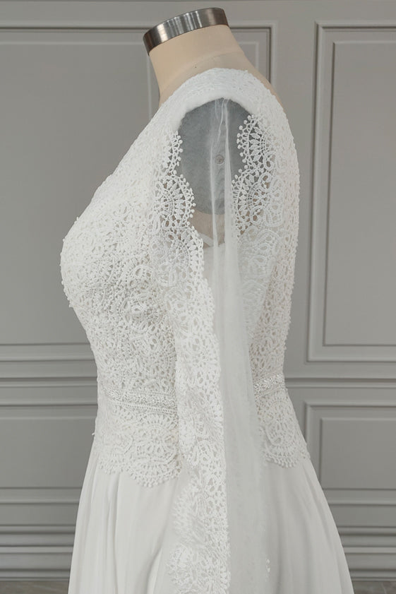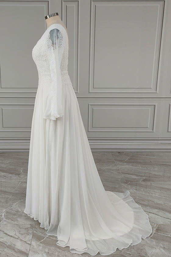 Les manches de cette robe de mariée sont minutieusement travaillées avec des motifs floraux délicats, apportant une dimension poétique et raffinée à l’ensemble. Conçue pour assurer un confort optimal tout au long de la cérémonie, la coupe cintrée de la robe souligne gracieusement les lignes naturelles du corps, tout en offrant une élégance fluide grâce à sa jupe légèrement évasée.
