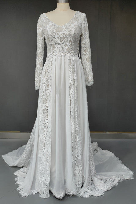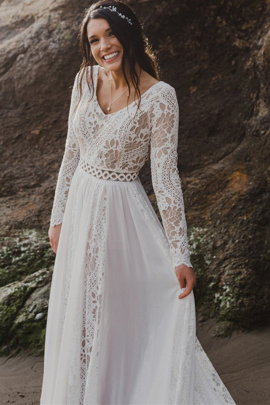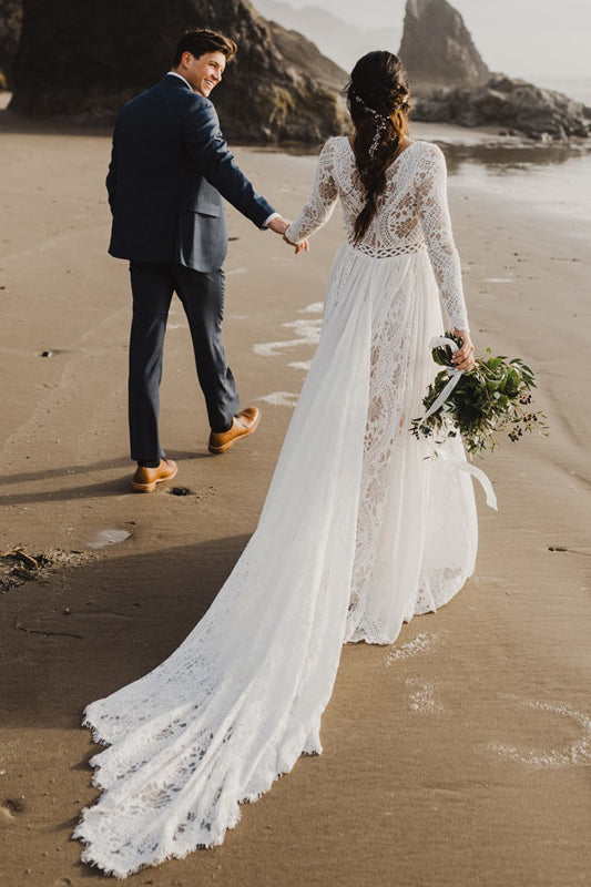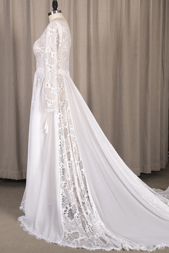Révélez votre beauté naturelle avec cette robe de mariée bohème chic à manches longues. Confectionnée dans une dentelle délicate, elle allie romantisme et élégance. Sa coupe met merveilleusement en lumière votre décolleté, tout en offrant une agréable sensation de liberté. Adoptez-la pour un mariage à la plage ou sur un doux gazon, elle est conçue pour toutes les silhouettes grâce à un éventail de tailles allant du 32 au 56. Experte à embrasser des formes variées, elle incarne la robe de mariée bohème grande taille par excellence.